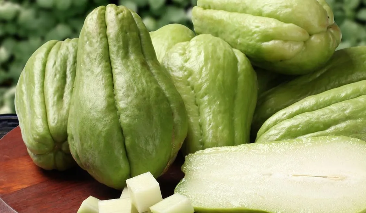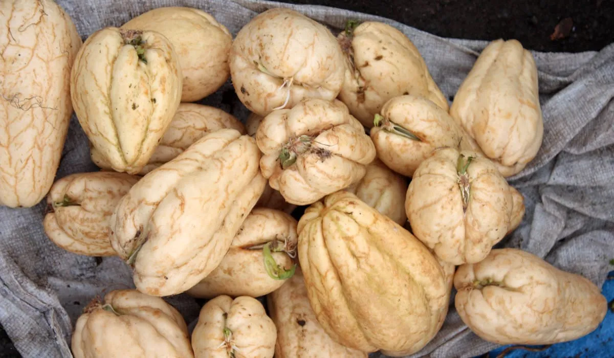 La christophine possède une chair blanche et aqueuse entourée d'une peau épaisse. Elle est cueillie avant l'enclenchement du processus de la graine.